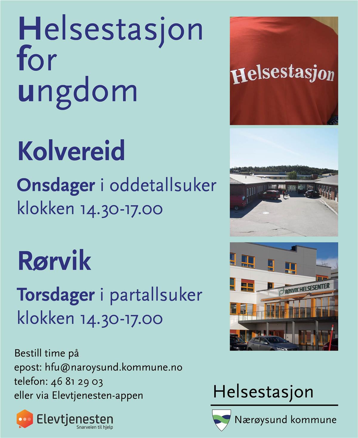 Helsestasjon for ungdom vil ha åpent annenhver uke på Rørvik og Kolvereid, med oppstart torsdag 9. april på Rørvik og onsdag 15. april på Kolvereid. Deretter vil helsestasjonen på Rørvik holde åpent på torsdager i partallsuker og på Kolvereid på onsdager i oddetallsuker. Begge steder vil ha åpent mellom 14.30 og 17.00. Åpningstidene følger skoleåret, i feriene kan ungdom ta kontakt for å få avtale med helsesykepleier eller jordmor på dagtid.